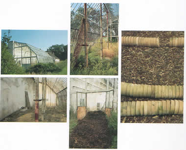 Treibhaus, hier vorgefundene Gegenstände: alte Badewanne, Regenmantel, Steine,
