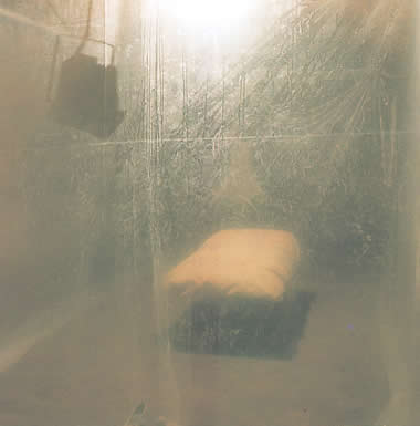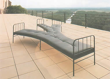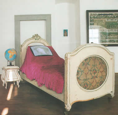 Videoinstallation mit Bett, Plastikgloben und Fernrohr. Aufstellung im kleinen