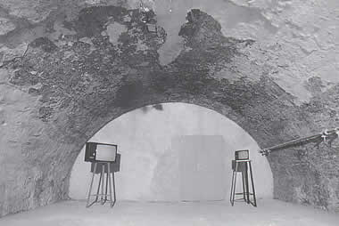 Videoinstallation mit zwei Bildschirmen in einem Kellergewölbe von Schloss Melnik.