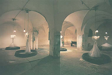 Reto EmchChoreographische Installation mit Brautkleidern, Wasserbecken, Motoren u.a. im Ludmilla-Saal von Schloss Melnik.