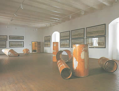 Christoph RihsKegel aus Holz, Wachs und Stahl; Installation im großen Kartensaal von Schloss Melnik.