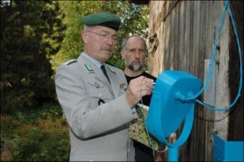 Yotaro Niwa "Shishiodoshi" | ist die traditionelle Form eines japanischen Gartenbrunnens. Die Bambuswippe am Ende der weit verzweigten Konstruktion aus Kupfer-Dachrinnen produziert bei Regen ein Geräusch – ein stiller akustischer Kontrast zu den Schießübungen der Bundeswehr in Munster.