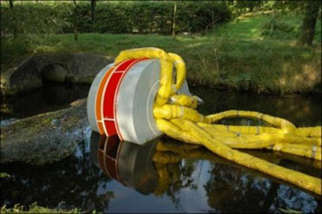 Dennis Feddersen "Hybrid LC-177" | Material: Holz, Lack, Styropor und LKW-Plane Skulptur im Wasser der Oertze nahe St.Urbani Kirche