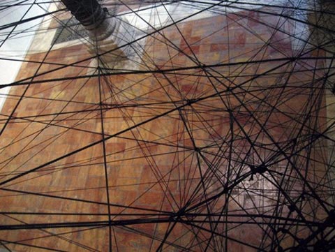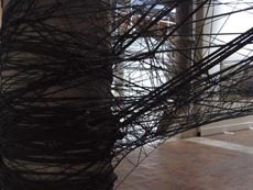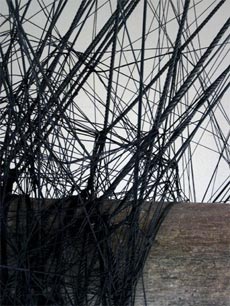 Üblicherweise verwendet die Künstlerin Klebeband unterschiedlichster Couleur, um Räume in bildhafte Installationen zu verwandeln. In Zaragoza sind es 2500 Meter schwarzes Seil, mit dem Monika Grzymala ein ü berdimensionales Konstrukt "spinnt", das sich elastisch wie ein Spinnennetz zwischen die Säulen des historischen Palacio de Sastago erstreckt. Fast bedrohlich erinnert die strahlen- förmig-diagonale Struktur an die , Schwarze Witwe', die nach der Paarung das Männchen in ihrem Netz frisst. Doch gleichermaßen verweist die Künstlerin mit ihrer "geklöppelten Arbeit&auf das anmutig elegante Bild spanischer Flamenco-Tänzerinnen in ihren mit Spitze umsäumten Kostümen.