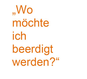 „Wo möchte ich beerdigt werden?“ stellt die Frage nach dem Ort, der mir über den Tod hinaus besonders am Herzen liegt, an dem ich mich auf Grund der emotionalen Bindung an meine Heimat, meiner Religionszugehörigkeit, meines Glaubens oder im Gedenken meiner Hinterbliebenen geborgen weiß.
