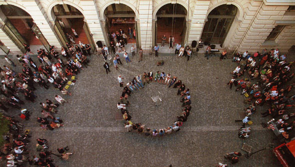 Zum zweiten Mal wurde der Salvatorplatz neben dem Münchner Literaturhaus zur Bühne für das Zusammenspiel von Literatur und Kunst im öffentlichen Raum. Das Münchner Duo "Empfangshalle" installierte unter dem Titel "laden und löschen" einen von einem Kran gehaltenen Ring grüner Plastiksitze als interaktive Skulptur, die zur Arena für Dichterlesungen wurde und das auf ihr Platz nehmende Publikum in Schwingung versetzte. In der zweiten Position wurde die Verwandlung von Literatur zu Kunst vollzogenen, indem ein Hölderlinsches metrisch aufgeschlüsseltes Gedicht als begehbare Installation auf die Fläche des Platzes übertragen wurde (Andreas Kaiser). Den Abschluss bildete die Videoinstallation der Gruppe Human Control, die eine U- Bahnstation direkt vor den Fenstern des Literaturhauses perfekt simulierte, begleitet von einer Lesung aus Geoff Rymans "253. Der U-Bahn-Roman".