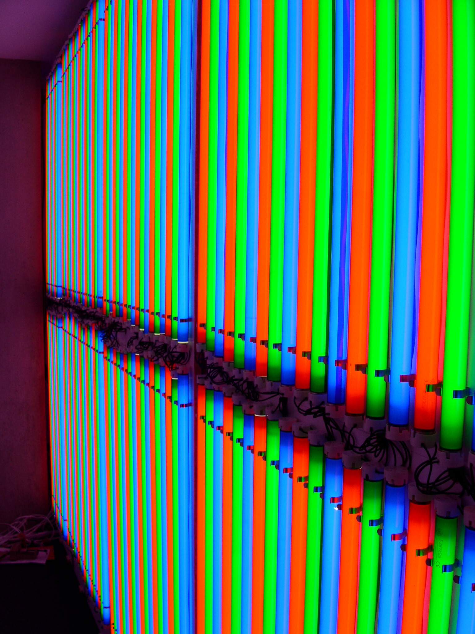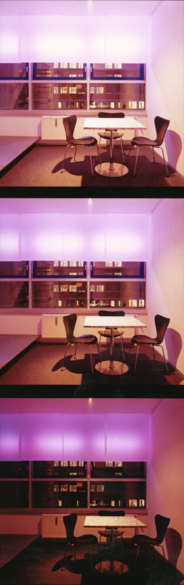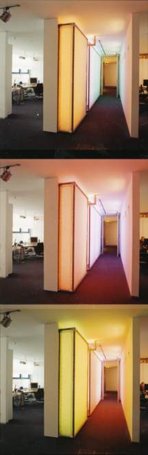 "Ich fühle mich sehr lebendig" / helles Gelb. "Ihr will nach Hause" / dunkles Grün. "meine Arbeit gibt mir Energie" / warmes Rot "Ich bin total verliebt" / Pink "How are you" bedeutet für Sabine Groß nicht nur standarisierte Begrüßungsformel des Mobilfunkkonzerns Vodafone. Stattdessen machte die Berliner Künstlerin die Frage zum Aufhänger ihrer interaktiven Arbeit "Psychofone", in der sie Befindlichkeiten der Vodafone Group R & D untersuchte und als "Kollektivkörper" nach innen und außen veröffentlichte. Die bewusst inszenierte architektonische Transparenz der Münchner Arbeitsräume wurde zum inhaltlichen Anspruch des interdisziplinären Projekts: Acht Monate konnten das Unternehmensteam und seine Besucher über Mausklick via Computer ihre Zustände, Wünsche und Kritiken kundtun - ein Pool unterschiedlicher Begriffe gekoppelt an Farben stand ihnen für die Eingabe persönlicher 'Tagesformen' zur Verfügung. Die Summe momentaner und zurückliegender Befindlichkeiten spiegelte eine Lichtanlage wieder. Hinsichtlich des Einzelnen blieb der farbig leuchtende "Kollektivkörper" wertneutral und machte dennoch eine definitive Entsprechung und Aussage zur 'Gruppe'.