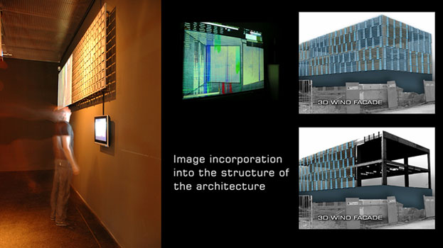 Es ist ein Prototyp für eine interaktive Gebäudefassade, die in einer dynamischen Beziehung zum Innenraum steht. Der von aussen auf das Gebäude einwirkende Wind oder von der Belüftungsanlage erzeugte Luftzug wird transformiert und in Form von Energie im Innenraum bereitgestellt.