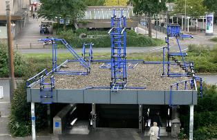 Four round 4 m high trampolines, constructed out of water pipes, transform by association the street space into a water situation – how do people deal with rivers and streams in the city? Rivers are used as an alternative to roads for transportation purposes, at the same time river and stream beds are filled in, re-routed or banned underground to make way for urbanisation.