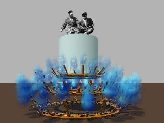 Projektentwürfe Yuri Leiderman (1963, Moskau) Geopoetics "Don´t burn or waste Carbon (natural gas),because the resource is limited!" As well following recently the slogan "transform geopolitics into geopoetics" Leiderman combines the two thesis and comes to the conclusion: Geopoetics = "geology" + "poetics" = waste resources (burning gas) + waste talks. The idea will be presented by a "living" sculpture on a flaming pedestal, on whose top there sit two Georgians bending to each other they are low talking about something in a friendly, confident way. The message is specially wide, but unclear -- waste historical references, waste anecdotes, waste talks about waste of burning gas.