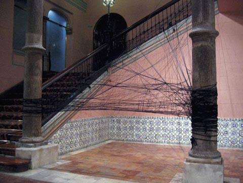 Üblicherweise verwendet die Künstlerin Klebeband unterschiedlichster Couleur, um Räume in bildhafte Installationen zu verwandeln. In Zaragoza sind es 2500 Meter schwarzes Seil, mit dem Monika Grzymala ein ü berdimensionales Konstrukt "spinnt", das sich elastisch wie ein Spinnennetz zwischen die Säulen des historischen Palacio de Sastago erstreckt. Fast bedrohlich erinnert die strahlen- förmig-diagonale Struktur an die , Schwarze Witwe', die nach der Paarung das Männchen in ihrem Netz frisst. Doch gleichermaßen verweist die Künstlerin mit ihrer "geklöppelten Arbeit&auf das anmutig elegante Bild spanischer Flamenco-Tänzerinnen in ihren mit Spitze umsäumten Kostümen.