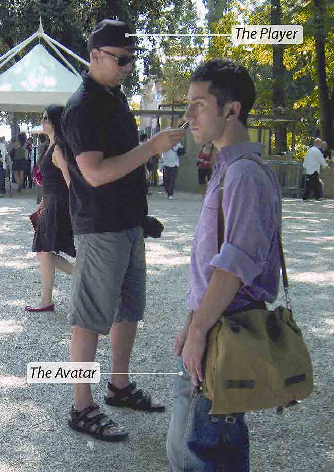 Intrigue ESilver & Hanne Rivrud aus Norwegen führen einen Avatar, gewöhnlich der grafische Stellvertreter einer echten Person in der virtuellen Welt, in die reale Öffentlichkeit ein. Über die Kommandotasten eines Mobiltelefons lassen sich der anfangs nicht identifizierbaren, lebenden Spielfigur nach Belieben Anweisungen erteilen. Am Ende zeigt uns das Display infamerweise den bei der Interaktion verursachten CO2-Ausstoß an.