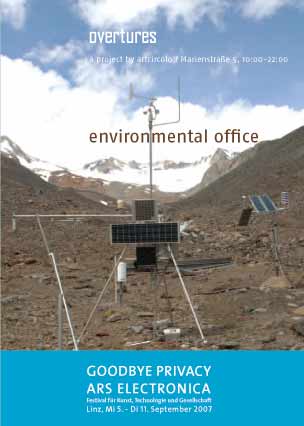 Auf der Ars Electronica 2007 inszenieren und betreiben Künstler zusammen mit Technologen und Wissenschaftlern in einem ehemaligen Geschäft in der Marienstraße ein Environmental Office mit Umwelt-Informationen, -Monitoring und –Steuerung, inklusive einem zukunftsorientierten Wasserspender zur Nachbereitung von Leitungswasser. Das ironische Zitat eines Büros ist als Anspielung auf das Selbstverständnis von Unternehmen in Relation zu ihrer gesellschaftlichen Glaubwürdigkeit zu verstehen. Die ausgewählten Projekte von Kalle Laar, Rúrí und Silver & Hanne Rivrud dokumentieren, wie Künstler mit aktuellen Kunstformaten aus dem Spektrum mobiler Technologien die Möglichkeiten der veränderten Kommunikations-, Interaktionsund Erzählweisen nutzen und zu brisanten gesellschaftlichen Fragen öffentlich Stellung beziehen.